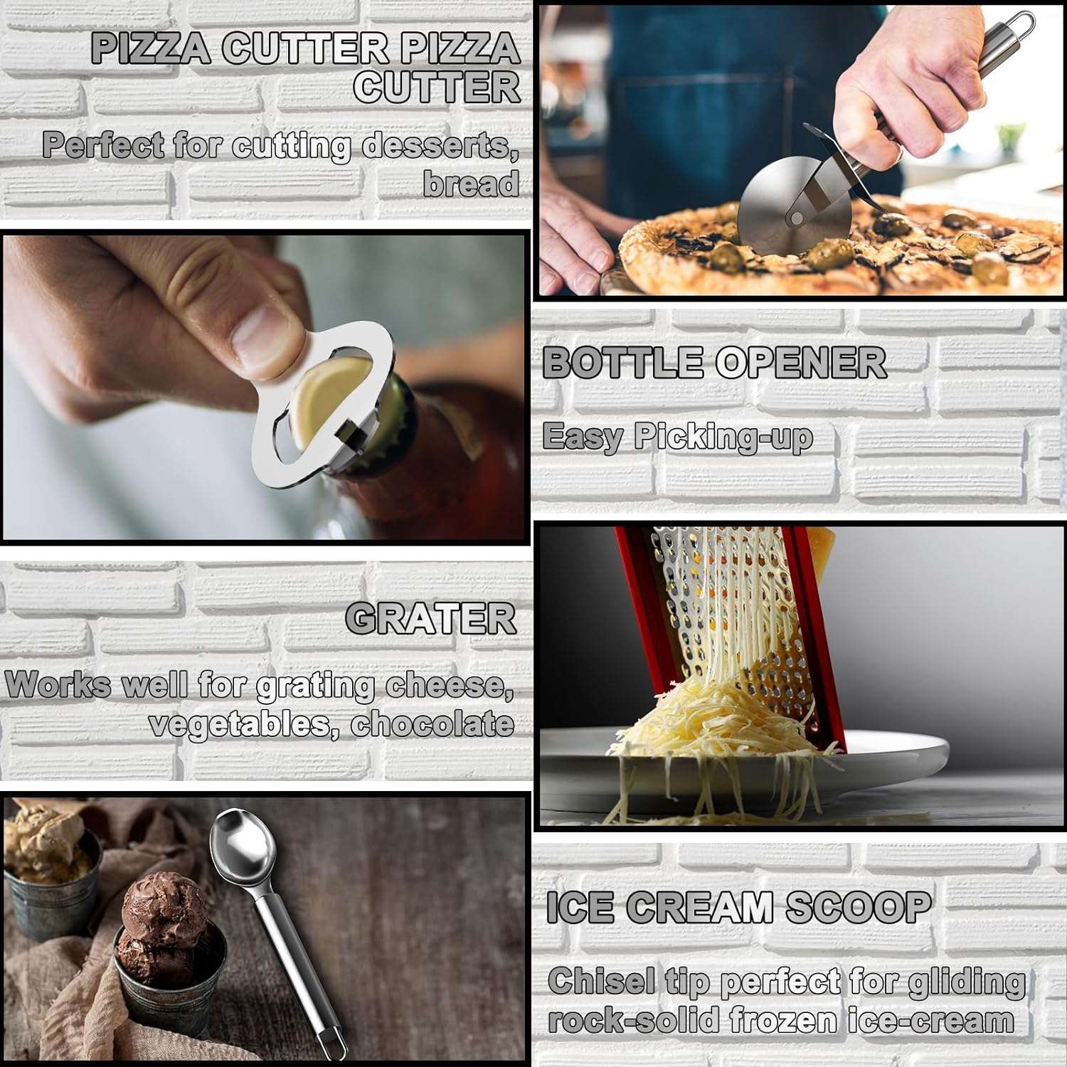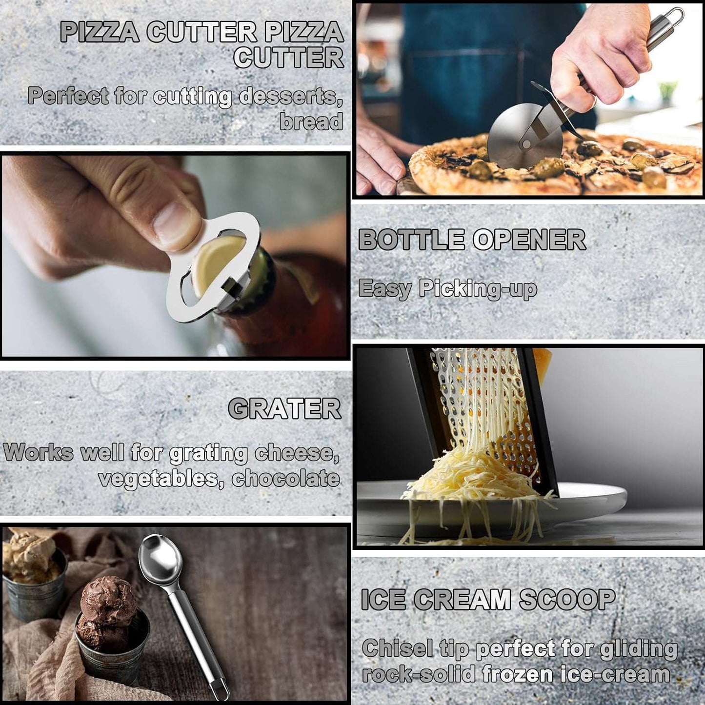 - EVERYTHING YOU NEED From the everyday kitchen spoons to the garlic crusher, we included all the kitchen stuff you could possibly need to bring out your inner chef. This means you don’t have to spend extra money on repetitive utensil tools. This cooking utensils set includes Slotted Spatula, Slotted Spoon, Turner, Pasta Server, Solid Spoon, Kitchen Tongs and other kitchen tools such as Pizza Cutter, Grater, Can opener, Scissors and so on. Almost everything you need in a kitchen is in one box.