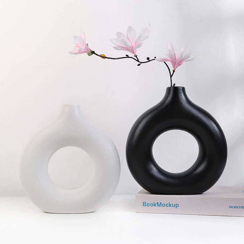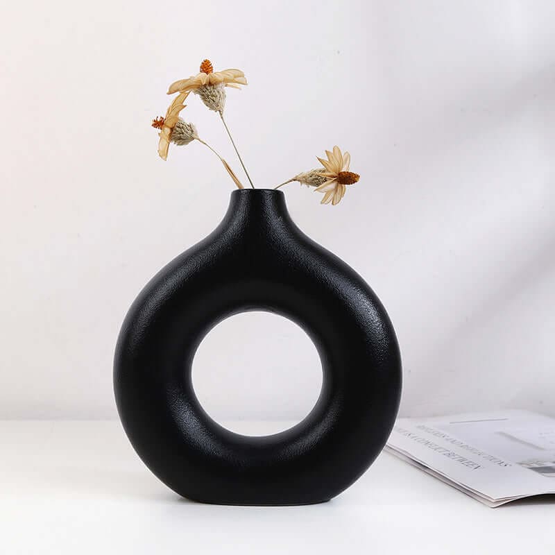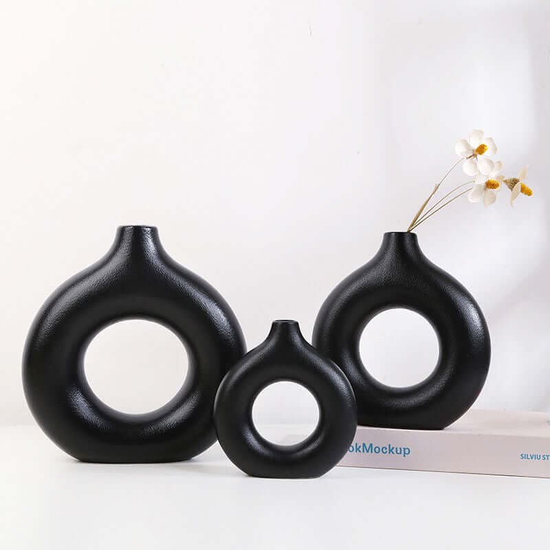 Introducing the Nordic 3-Piece Ceramic Vase Set - White Donut Design, the perfect addition to your home decor. Made from high-quality ceramics, this set features a unique donut design that adds a touch of whimsy to any room. The set includes three different sizes, making it versatile for displaying dry flowers or as desktop decor. Each vase is carefully crafted with attention to detail, ensuring a beautiful and durable product. The set comes in ordinary packaging and is patent-sourced. Available in both white and black, with sizes ranging from large to small, and also in a round shape. This product is suitable for cross-border export and is perfect for gift-giving occasions such as weddings, birthdays, and housewarming. It is suitable for all relationships, from younger generations to elders, making it a versatile gift option. Whether it's for personal or business purposes, this European-style vase set is sure to impress.